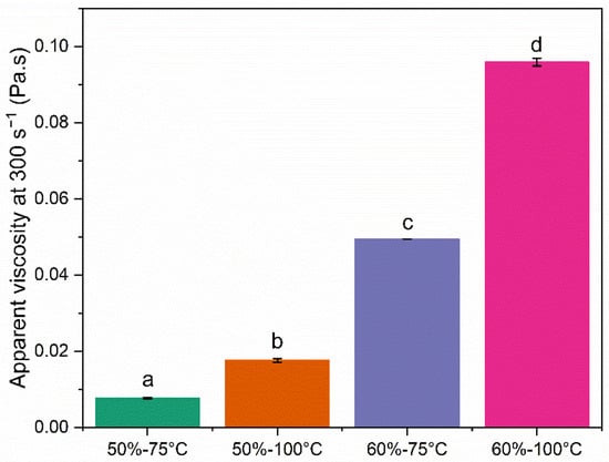 The apparent viscosity of the emulsions (at shear rate = 300 s−1) increased significantly (p < 0.05) with the TS, as well as with the pasteurization temperature (Figure 2).