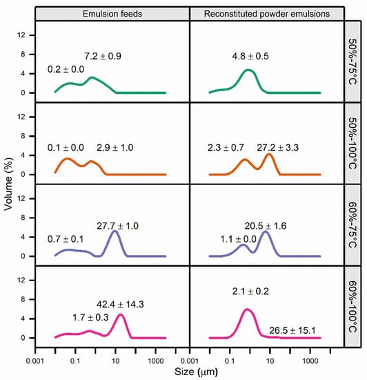After spray drying and reconstitution, the emulsions preheated at 75 °C (50%-75 °C and 60%-75 °C) showed a slight reduction in the size of the predominant population. On the other hand, the PSD of the emulsions preheated at 100 °C showed important size changes over spray drying and/or reconstitution (Figure 3). The particle size of the 50%-100 °C reconstituted emulsion was significantly larger (p < 0.05) than the 50%-100 °C feed emulsion, with the population of larger particles increasing from a mean diameter of 2.9 to 27.2 µm. On the contrary, the particle size of 60%-100 °C was significantly reduced (p < 0.05) over the spray-drying and/or reconstitution processes. The mean particle size of the main population in the 60%-100 °C feed emulsion was 42.4 µm, while in the reconstituted emulsion, the main population had a mean particle size of 2.1 µm and a very small population of 26.5 µm.