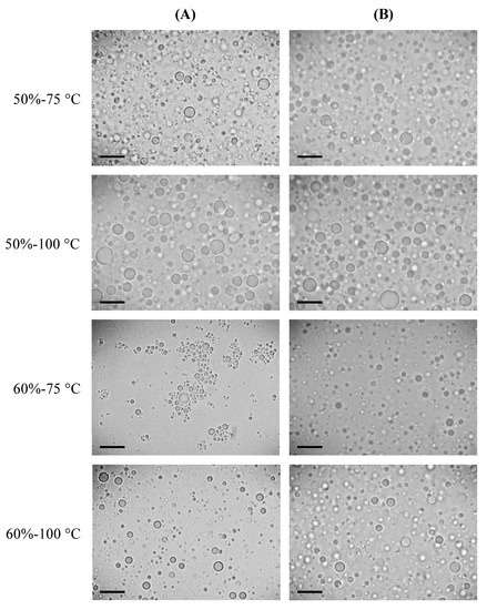The particle size results obtained by light scattering showed that the 50%-100 °C and 60%-75 °C spray-dried emulsions reconstituted in water presented bimodal distributions, whose main populations had a larger mean diameter than 50%-75 °C and 60%-100 °C (Figure 3). These results were visually confirmed by microscopy (Figure 4A). However, important differences between the 50%-100 °C and 60%-75 °C reconstituted emulsions were evident under the microscope. While 50%-100 °C exhibited droplets of large diameter (Figure 4A), 60%-75 °C was composed of aggregated droplets of smaller size (Figure 4A and Figure 5). The spray-dried reconstituted emulsions were further reconstituted in a 1% SDS solution, to identify the instability mechanism, such as coalescence or flocculation (Figure 4B). SDS is an anionic surfactant that generates strong electrostatic repulsive forces; however, adding SDS did not affect the microstructure of the 50%-100 °C emulsion. Therefore, the increase in particle size observed in 50%-100 °C after spray drying and reconstitution (Figure 3) could be attributed to coalescence. On the other hand, the presence of SDS induced the disaggregation of the oil droplets in 60%-75 °C, indicating that the aggregation mechanism observed in 60%-75 °C reconstituted in water corresponded to flocculation.