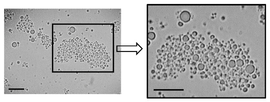 Micrograph (100×) of IMF powder emulsion 60%-75 °C reconstituted in water (left image) and magnification of the selected black rectangle (right image). Black bars represent 50 µm.