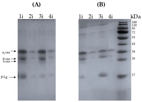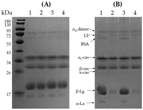 Under reducing conditions, no differences were found among the protein profiles of the reconstituted emulsions (Figure 6A, lanes 1–4). The IMFs were formulated to have a 60:40 whey protein to casein ratio, and, considering that β-lactoglobulin (β-Lg) comprises ~50% of the total whey proteins [20], it represents ~30% of the total protein present in the IMFs. Under nonreducing conditions (Figure 6B), in 50%-100 °C (Lane 2) and 60%-100 °C (Lane 4), α-lactalbumin (α-La) and bovine serum albumin (BSA) were almost imperceptible, while β-Lg was significantly reduced. These changes were not observed for 50%-75 °C and 60%-75 °C, indicating that pasteurization at 100 °C during IMF production provoked protein aggregation through reducing bonds, such as disulfide bridges, inducing the formation of high-molecular-weight aggregates that did not enter the gel, and was, therefore, not detected under nonreducing conditions (Figure 6B).