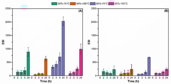 Emulsion stability index (ESI) at the lower ((A), height = 2–3 cm) and higher ((B), height = 10–12 cm) of the reconstituted 50%-75 °C (green), 50%-100 °C (orange), 60%-75 °C (purple), and 60%-100 °C (pink) IMF emulsions, after 0, 2, 3, 5, and 24 h.