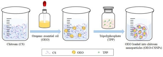 The ion cross-linking method was used to prepare nanoparticles, as reported by Zeinab et al. [22]. To obtain a chitosan solution, an appropriate quantity of chitosan powder was weighed (BSA224S-CW, Sartorius, Beijing, China), dissolved in 1% acetic acid solution at room temperature, and stirred (RH digital, Ai Card Instrument Equipment Co., Ltd., Guangzhou, China) at 600 r/min for 12 h. Before filtering through a 0.45 μm microporous membrane, the pH was adjusted to 4 with a 5 mol/L sodium hydroxide solution. The essential oil emulsifier Tween-80 was added, and the mixture was stirred and thoroughly mixed. Oregano essential oil was added to the filtered chitosan solution, and the mixture was stirred at 600 r/min for 60 min while remaining at room temperature. To obtain the OEO-CSNPs suspension, chitosan and TPP solution were combined (TPP was dissolved in ultrapure water and thoroughly dissolved before filtering through a 0.45 μm microporous membrane) at a volume ratio of 5:2, and the mixture was gently stirred for 60 min. The inner layer of an ultrafiltration centrifuge tube (Millipore, MA, USA) was removed after centrifugation (5810 R, Eppendorf Company, Hamburg, Germany) at 8000 r/min for 30 min, washed several times with ultrapure water, and then ultrasonicated (KH3200E, Jintan Medical Center, Changzhou, China). OEO-CSNPs were dispersed (Instrument Factory, China) for 5 min, pre-frozen at −76 °C (ULTS1386, Thermo Fisher, Waltham, MA, USA) for 3 h, and then vacuum-lyophilized (FDU-1200, Shanghai Ailang Instrument Co., Ltd., Shanghai, China). It was stored at 4 °C until use. The formation process of OEO-CSNPs is shown in Figure 1.