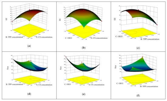 The three-dimensional surface representation of the experiment. Plots (a–c) and (d–f) show the effects of CS concentration (A), TPP concentration (B), and OEO addition (C) on the EE% and particle size of OEO-CSNPs, respectively.
