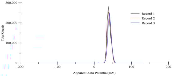 Essential evaluation criteria for nanoparticle performance include particle size, zeta potential, and PDI. The CS concentration was 1.63 mg/m, under optimal preparation conditions, the TTP concentration was 1.27 mg/mL, the essential oil concentration was 0.30%, the pH was 4.0, and the stirring time was 60 min. Figure 3 shows that the average particle size of OEO-CSNPs was 182.77 ± 4.83 nm, with a typical size distribution curve, and the size distribution was narrow (polydispersity coefficient PDI was 0.26 ± 0.01, PDI was correlated with molecular stability). Mohammadi et al. [37] studied the average size of 100–190 nm after the Cinnamomum zeylanicum essential oil was encapsulated into nanoparticles. Cai et al. [36] found that the PDI values of chitosan nanoparticles with Ocimum basilicum EO ranged from 0.222 to 0.425. The smaller the value, the more effectively and uniformly nanoparticles are dispersed throughout the solution [38]. The electrostatic interaction between the surface charges of the particles will result in particle aggregation, dispersion, and flocculation. Therefore, to detect the size of the charge and then evaluate the stability of the nanoparticles, the zeta potential was determined. If the zeta potential value of a suspension is higher than +30 mV, it is considered physically stable [39]. The zeta potential of the prepared OEO-CSNPs was +40.53 ± 0.86 mV, indicating that they were remarkably stable (Figure 4). López-Meneses et al. showed that the zeta potential of chitosan nanoparticles after the addition of Schinus molle EO was +40.2 ± 7.5 mV [39]. Hesami et al. [40] found that the zeta potential value of CNPs containing Chelidonium majus EO was in the range of +26.46 to +33.1 mV. Due to the cationic nature of CS and the presence of residues that do not interact with TPP molecules, the zeta potential was positive. These amino groups inhibit the adsorption of anions, resulting in the formation of stable nanoparticles through the maintenance of a thick electric double layer [23].