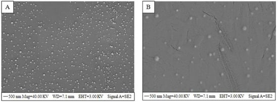 The morphology of the nanoparticles was observed by a scanning electron microscope. The SEM images of CSNPs (A) and OEO-CSNPs (B) in Figure 5 show that the nanoparticles exhibited a spherical regular distribution and stability during the preparation process. The shape of chitosan nanoparticles was the same before and after the addition of OEO, and Kbaa et al. [35] also found that Cymbopogon citratus EO incorporation did not alter the particle shape. Comparing the size of chitosan nanoparticles before and after OEO addition reveals that the new particles were marginally larger. However, Sotelo-Boyas et al. found [41] that the nanoparticle size differed depending on the preparation method and experimental conditions and that the increase in nanoparticle size was associated with CEO adsorption or interaction with each CSNP component [39].