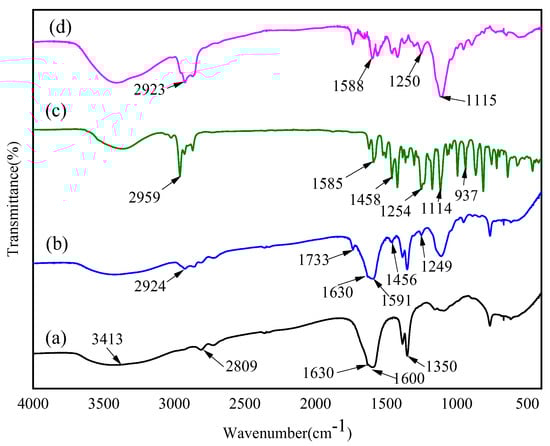 The overlap of the -OH stretching vibration absorption peak of hydrogen bonds and -NH2 stretching vibration absorption peak at 3413 cm−1 indicates the formation of the stretching vibration. Chitosan contains numerous distinct hydrogen bonds: a broad peak range at 2809 cm−1 (-CH stretching), and three characteristic absorption peaks of amino polysaccharides: 1634 cm−1 (amide I, C=O stretching), 1600 cm−1 (amide II, N-H bending), and 1350 cm−1 (amide III, N-H bend) (Figure 6a) [30]. As shown in Figure 6c, the cross-linking of chitosan and TPP is expected to shift some of the amide group-related peaks, with the peak at 1634 cm−1 shifting to 1630 cm−1 and the peak at 1600 cm−1 shifting to 1591 cm−1, confirming the occurrence of ionic cross-linking reaction [30]. Similar results were obtained by Matshetshe et al. [29] studying the interaction between chitosan and TPP. In addition, the appearance of 1249 cm−1 (C-O-C stretching), 1456 cm−1 (amide II), and 1733 cm−1 (C=O stretching) may be attributed to electrostatic interaction [15]. The absorption peaks of oregano essential oil (Figure 6d) are 2959 cm−1 (-OCH2 stretching), 1589 cm−1 (N-H bending), 1458 cm−1 (CH2, bending), 1254 cm−1 (C-O-C stretching), 1117 cm−1 (C-O-C stretching), and 937 cm−1 (-CH bending) [42]. The above characteristic absorption peaks appear at the same wavenumber, and the OEO significantly increases the intensity of the C-H stretch peak at 2867–2955 cm−1, as shown in Figure 3e at 2923 cm−1. Strong C-H stretching vibration peaks indicate that the OEO ester functional groups are encapsulated within the nanoparticles [36]. These findings are in agreement with the results of Esmaeili et al. [30], Seyed et al. [34], and Hesami et al. [40]. The results showed that OEO was encapsulated in CSNPs without changing its structure or function, indicating that its antibacterial and antioxidant properties remained intact.