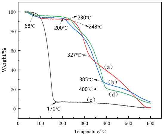 TGA analysis is a thermal analysis technique that measures the relationship between the mass of the test sample and the change in temperature at a specific program-controlled temperature [36]. The TGA thermograms in Figure 7 revealed mass loss as a function of temperature for the chitosan powder (a), CSNPs (b), OEO (c), and OEO−CSNPs (d). OEO begins to decompose at approximately 68 °C in the nitrogen environment and loses approximately 92.54% of its mass by 170 °C, which fully reflects the volatile characteristics of essential oil core material [43]. This is similar to the results of Seyed et al. [42] studying the weight loss of OEO. In contrast, the wall material has higher stability. At 243 °C, chitosan undergoes its initial degradation, resulting in a mass loss of approximately 8% due to the evaporation of adsorbed water associated with the hydrophilic group of the polymer. Dehydration of the hydro-glycosidic ring, deacetylation, depolymerization, and decomposition of acetylated chitosan units resulted in the second degradation at 327 °C [30]. CSNPs exhibited different thermal properties than chitosan due to the reaction between CS and TPP. The initial degradation of CSNPs occurred at 230 °C, whereas the second occurred at 385 °C, thereby increasing the degradation temperature of CS. The CEO−CSNPs were degraded at 230 °C and 400 °C, respectively. In conclusion, the chitosan and TPP cross-linking reaction occurred, resulting in the encapsulation of OEO. The OEO−CSNPs shifted the first OEO degradation event from 68 °C to 230 °C and the second from 170 °C to 400 °C, resulting in increased stability [44]. Hosseini et al. [33] and Esmaeili et al. [30] also reported similar findings.