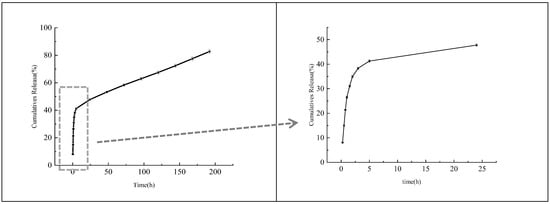 Figure 8 shows that OEO-CSNPs can be released continuously for several days, with a biphasic release pattern consisting of a burst release and a subsequent slow release. This corroborates the findings of Sotelo-Boyas et al. [41]. The burst release exhibited a release amount of 41.27 ± 0.56% at the 5th hour, and the subsequent 8 days of continuous release resulted in 82.73 ± 1.53%. Rapid dissolution of the initial burst could have caused the instant burst of molecules of essential oil molecules adsorbed to the surface of the polymer [35]. Studies suggest that polymer degradation is the primary mechanism by which CSNPs release essential oils into the external environment [45]. The slower release phase is caused by the diffusion of encapsulated essential oil molecules from the nanoparticle core to the dissolution medium through interconnected pores and channels in the polymer matrix. When combined with the hydrophobic behavior of essential oils, they exhibit a slower water absorption rate, thereby decreasing the polymer degradation rate, which is similar to other results concerning hydrophobic materials [46]. Therefore, the chitosan nanoparticles found in oregano essential oil lengthen its duration of action and allow for sustained release [47]. Esmaeili et al. [30] and Yin et al. [48] reported that encapsulation effectively reduced the loss and volatilization of essential oils and their migration rate into the external environment. Encapsulating the essential oil and using it as an antibacterial agent ensures that the initial stage is not too slow to achieve a suitable antibacterial concentration and that the slow stage can maintain activity for an extended time. In contrast, the essential oil becomes ineffective if the initial phase is too rapid [49].
