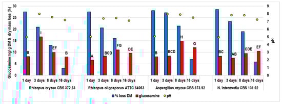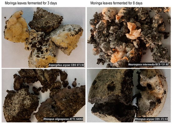 The fermentation was performed for 16 days; samples were collected after 1, 3, 8, and 16 days. The changes in the substrate pH, DM loss, and fungal glucosamine content were monitored during incubation (Figure 1). Moringa leaves were an appropriate substrate for the fungi, as samples fermented for 1 day contained 6.2–8.29 mg glucosamine per gram of DM. Mycelium was also visible on the substrate surface, except for the R. oligosporus strain. The products obtained after 3 days were compact and overgrown with mycelium, with visible spores on the surface. Figure 2 shows the representative samples obtained in the experiment. The pH markedly increased after 3 days of fermentation, from around 4 (pH of the inoculated substrate) to 7–8, then remained within this range. The DM loss suggests that the metabolic activity of the moulds decreased after 8 and 16 days of incubation.