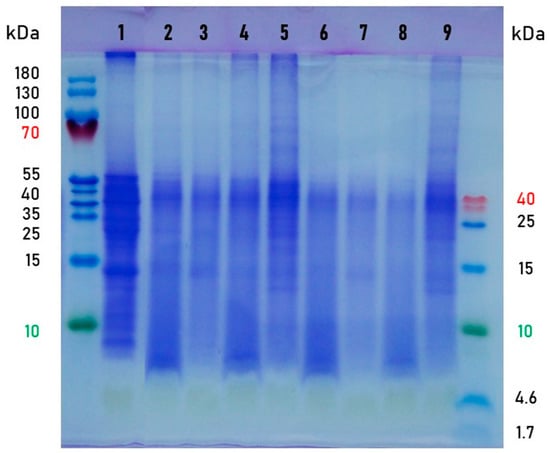 SDS-PAGE analysis of protein profiles in moringa leaves. Sample description: the dried leaves (1); the fermented leaves: Rhizopus oryzae—3 days (2) and 8 days (6), Rhizopus oligosporus—3 days (3) and 8 days (7), Aspergillus oryzae—3 days (4) and 8 days (8), Neurospora intermedia—3 days (5) and 8 days (9).