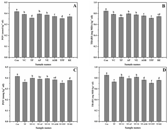 Changes of POV and TBARS of krill oils added with different single antioxidants (A,B) and composite antioxidants (C,D) during the extraction process. Con was the control krill oil without adding any antioxidants; VC, TP, AP, VE, AOB, TPP and RE were the krill oils added with vitamin C (VC), tea polyphenol (TP), ascorbyl palmitate (AP), vitamin E (VE), antioxidant of bamboo leaves (AOB), tea polyphenol palmitate (TPP) and rosemary extract (RE), respectively; TP-VC, TP-AP, TP-VE, TP-AOB, TP-TPP and TP-RE were the krill oils added with the binary mixtures comprised of TP and one of the other six antioxidants (VC, AP, VE, AOB, TPP and RE), respectively. All experiments were repeated three times. Different letters (a–f) indicate significant differences from each other (p < 0.05).