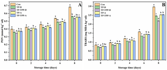 The POV values of all krill oils went up significantly, accompanied by the increase in storage time at 60 °C (Figure 2A), showing that all the oils were progressively oxidized (p < 0.05). Post to 2, 4, 6, and 8 days of storage, the POV values of TP-D (added with TP during the extraction process), TP-TPP-D (added with TP-TPP during the extraction process), TP-A (added with TP after the extraction process) and TP-TPP-A (added with TP-TPP after the extraction process) were significantly lower than that of the control group without adding any antioxidants, indicating that these antioxidants could significantly retard the primary oxidation of krill oils (p < 0.05). Importantly, adding antioxidants during the extraction process is more effective than adding antioxidants after the extraction process. For example, after 4 days of storage, the POV values of the control, TP-D, TP-TPP-D, TP-A, and TP-TPP-A groups were 0.46, 0.42, 0.40, 0.44, and 0.42 mmol/kg, respectively. Apparently, the order of inhibitory ability was: TP-TPP-D > TP-TPP-A > TP-D, TP-A > Con (p < 0.05).