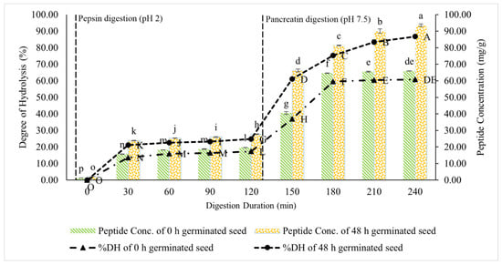 The %DH is presented as a line curve, and the peptide concentration is a column curve. The 0 (control sample) and the 48 h (test sample) germinated seed significantly increased the pancreatic digestion phase. The percentage of the DH from the control sample was 36.96% at 150 min digestion and reached up to 60.81%, at the end of the digestion period. These values aligned with the peptide concentration, whose values ranged from 40.58 mg/g (150 min) to 65.96 mg/g (240 min). The test sample showed a higher %DH and peptide concentration. The %DH of the test sample increased from 61.03% (150 min) to 86.76% (240 min). The peptide concentration increased from 66.2 mg/g (150 min) to 93.57 mg/g (240 min).