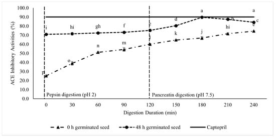 ACE-I activity of the germinated lamtoro gung flour at different digestion durations. Values are means with their SDs. Different letters indicate significant differences between the samples (Duncan’s test, α = 0.05).