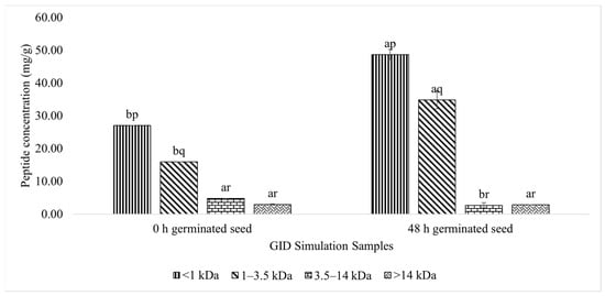 Peptide concentration of the germinated lamtoro gung flour at different fractions after the GID simulation. Values are means with their SDs. a and b indicate significant differences between the same fraction peptide in different samples (t-test, α = 0.05). p, q, and r indicate significant differences between the different peptide fractions in the same sample (Duncan’s test, α = 0.05).