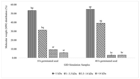 MW distribution of the germinated lamtoro gung flour peptide in different fractions after the GID simulation. Values are means with their SDs. a and b letters indicate significant differences between the same peptide fraction in different samples (t-test, α = 0.05). p, q, and r indicate significant differences between the different peptide fractions in the same sample (Duncan’s test, α = 0.05).