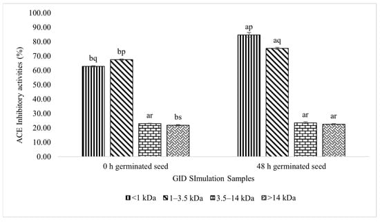 ACE-I activity of the germinated lamtoro gung flour peptide in different fractions after the GID simulation. Values are means with their SDs. a and b indicate significant differences between the same peptide fraction in different samples (t-test, α = 0.05). p, q, r, and s indicate significant differences between the different peptide fractions in the same sample (Duncan’s test, α = 0.05).