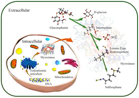 Myrosinase is a beta-thioglucosidase glucohydrolase that was originally discovered in cruciferous plants; it can resist in vitro damage and degrade glucoraphanin [61,62,63]. Studies have found that some microorganisms can also synthesize myrosinase (Table 1) [64,65,66]. Naoki Tani et al. first isolated a species of Enterobacter cloacae, which could synthesize myrosinase, but its molecular weight was smaller than the endogenous myrosinase of the plant. Meanwhile, Bacteroides thetaiotaomicron (another dominant species derived from the human colon) could convert glucosinolates into allyl isothiocya-nate [67]. With the further development of research on SFN production by intestinal flora, it was discovered that a variety of intestinal strains can degrade glucoraphanin to produce SFN [68].