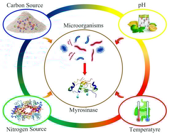 Microorganisms are organisms that can adapt to various complex growth environments and exhibit different physiological characteristics and life activities [79,80]. Enzymes synthesized by microorganisms have a long history of application in the fermentation industry, such as in the production of cheese, yogurt, milk powder, and the Chinese liquor, Daqu. Research shows that the efficiency of microbial myrosinase production is affected by the culture conditions (Figure 2) [79,81,82]. In these studies, nutrient content is an important factor in determining the synthesis of myrosinase by microorganisms, and the external environment also affects the myrosinase production efficiency of microorganisms. Therefore, it is very important to determine the factors that affect the myrosinase-synthesizing activities of microorganisms that stably express myrosinase genes.