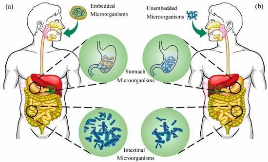 Protect effect of micro-encapsulated delivery system on probiotics. (a) Microorganisms enter the intestine under the protection of microcapsules; (b) microorganisms enter the intestine without the protection of microcapsules.