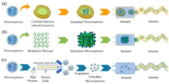 The protection principle of different embedding methods for microorganisms. (a) Microspheres/microcapsules mainly used colloidal materials with pH sensitivity to achieve multilayer embedding of microorganisms, and microcapsules disintegrated layer by layer to help microorganisms targeting release at the specific site in intestine. (b) Biopolymer microgels mainly protected microorganisms by adding colloidal antacids. Colloidal antacids maintained a neutral internal pH of biopolymer microgels under stomach conditions due to the ability of the hydroxyl ions for colloidal antacids to neutralize hydrogen ions arising from the gastric fluids. (c) Electrospraying made the emulsion dispersed into uniform and stable micron or nanometer droplets by high pressure and applied electric field.