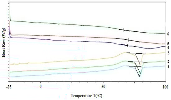 DSC curves of samples before (1—OTSL; 2—OTL; 3—OSL) and after (4—OTSL; 5—OTL; 6—OSL) baking.