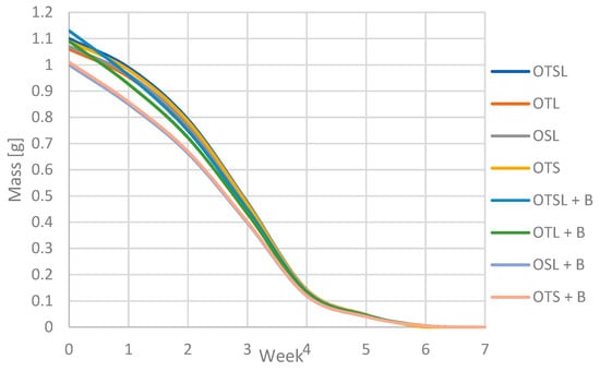 All types of the produced packaging samples were subjected to the biodegradation process. The samples were placed in the ground and in the pot and then exposed to the outside to reproduce various weather conditions. Every week, the samples were weighed after prior cleaning and stabilization of the weight in the exicator to drain humidity. After weighing, the test was replaced in the ground and staged outside. Weather conditions were 20–35 °C and moderate rain 6 times per month. The analysis was made for packaging after baking and after 8 weeks of storage. The samples after baking, which were biodegradable within 4 weeks, had reduced their weight by 80%. The products with beeswax coating were the most biodegradable. This may be due to the faster breakdown of beeswax compared to olive pomace. During the further degradation of the samples, those without beeswax degraded by 100%, while those with the beeswax coating by about 90%. The samples with the powder coating degraded completely by week 7. The result of the decrease in masses and the biodegradation process is shown in Figure 3 and Figure 4.