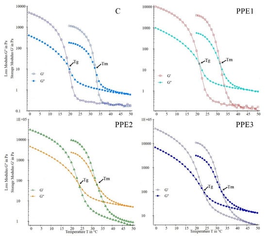 Effects of pomegranate peel extract (PPE) concentration on the storage (G′) and loss (G″) modulus of gelatin/sodium alginate composite solutions during heating and cooling process. (C: Control, without PPE; PPE1: gelatin/sodium alginate solution with 1% PPE; PPE2: gelatin/sodium alginate solution with 2% PPE; PPE3: gelatin/sodium alginate solution with 3% PPE; Tm: Melting temperature (°C); Tg: Gelation temperature (°C)).