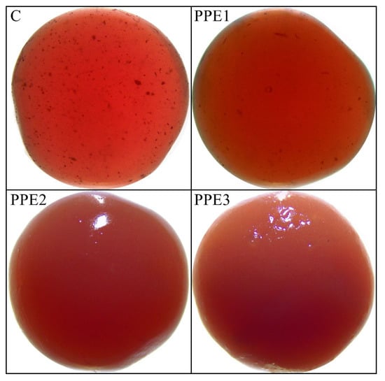 The hardness and elasticity of a hydrogel-type food product are crucial parameters that directly affect consumer acceptability. These parameters can easily and rapidly be determined by the texture profile analysis, and the results are provided in Table 2. Hardness, cohesiveness, gumminess and adhesiveness play an important part in swallowing physiology. Properties such as greater hardness, adhesiveness, and gumminess, and reduced cohesiveness are generally connected to a higher risk of aspiration []. The soft gel structure of “Boba balls” is widely utilized during the consumption of beverages such as milk tea, coffee, and yogurts. Therefore, a softer gel-forming agent is necessary to be easily chewed and swallowed. The hardness, gumminess, and chewiness values of samples decreased insignificantly (p > 0.05) for the control and PPE1 samples; however, the further addition of PPE significantly (p < 0.05) decreased the hardness. The decreasing hardness values after the 0.25% purple-sweet-potato-peel anthocyanin addition were also reported by Liu, Xiao, Feng, Zhang, Li, Tu and Niu []. The gel, which has a high springiness, is structurally divided into several large pieces upon the initial compression. In contrast, gels with lower springiness will structurally break into many small pieces at the end of the first compression []. Springiness values were stable for all samples up to 3% PPE addition and then significantly (p < 0.05) increased. The degree of difficulty required to break down the gel’s internal structure is an indication of the cohesiveness value. Although control, PPE1, and PPE2 showed the highest cohesiveness results, the lowest value was determined for PPE3. This means that the internal structure of “Boba balls” containing PPE at 1 and 2% was better than those containing 3% PPE. Resilience displays the degree to which a product strives to regain its initial height. PPE3 showed the lowest resilience and control, and PPE2 had the highest results.