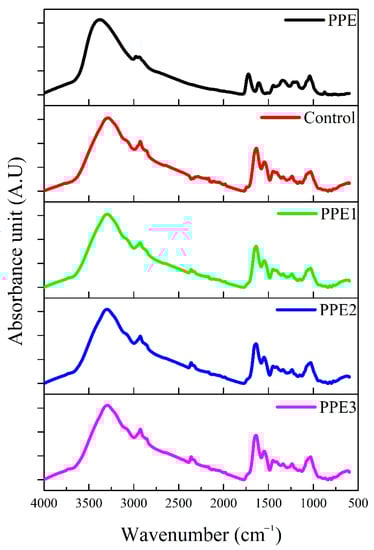Effects of pomegranate peel extract (PPE) concentration on the Fourier transform infrared (FT-IR) spectrums. (PPE: pomegranate peel extract; C: Control without PPE; PPE1: “Boba balls” containing 1% PPE; PPE2: “Boba balls” containing 2% PPE; PPE3: “Boba balls” containing 3% PPE).