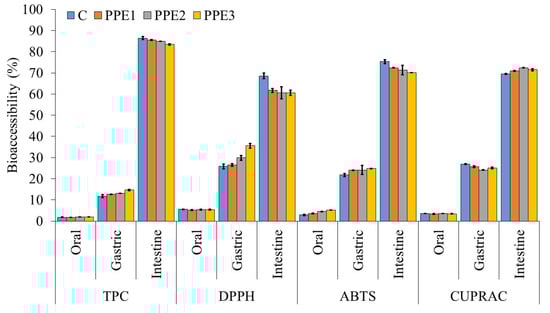The in vitro bio-accessibility of “Boba balls” containing pomegranate peel extract (PPE) at various concentrations. (C: Control without PPE; PPE1: “Boba balls” containing 1% PPE; PPE2: “Boba balls” containing 2% PPE; PPE3: “Boba balls” containing 3% PPE).