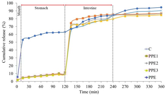 Release pattern of pomegranate peel extract (PPE) from “Boba balls” in the simulated gastrointestinal conditions. (PPE: pomegranate peel extract; C: Control without PPE; PPE1: “Boba balls” containing 1% PPE; PPE2: “Boba balls” containing 2% PPE; PPE3: “Boba balls” containing 3% PPE).