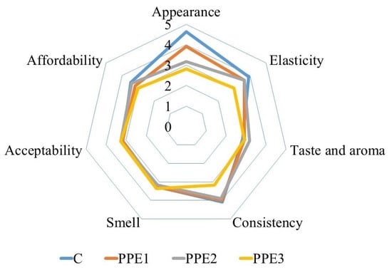 The sensory properties of “Boba balls” enriched with PPE at various concentrations are depicted in Figure 8. The addition of PPE to “Boba balls” had insignificant (p < 0.05) effects on some sensory properties of the final product but did not change other sensory properties such as taste and aroma, smell, acceptability, and affordability. However, the appearance, elasticity, and consistency scores of “Boba balls” decreased with an increasing PPE ratio. The changes in sensory scores are well supported by Figure 3, showing that the opacity of “Boba balls” increased when the PPE ratio increased; hence, the appearance scores decreased. Moreover, the increasing PPE ratio caused the decreasing elasticity. The decreased elasticity may be due to increasing the total dry matter of “Boba balls”; this result is well supported by Figure 2, in which the elastic modulus increased with increasing PPE ratio. When the consistency values from the panelists were examined, it was clear that all samples, except for PPE3, had similar consistency, and the lowest consistency result was observed from PPE3. As a general evaluation of sensory scores, the PPE enrichment of “Boba balls” had no significant effect on the acceptability and affordability of the final products, which were close to the control sample. Thus, PPE could be used as supplementary material for “Boba balls” to enhance antioxidant and bio-accessibility properties.