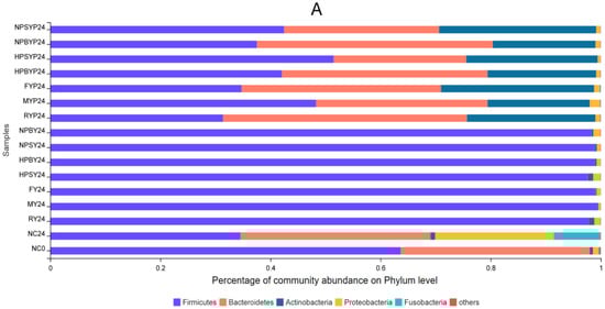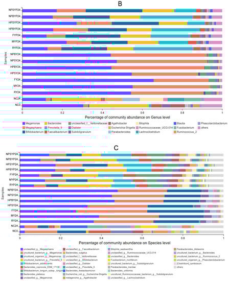 Relative bacterial abundance (at the phylum/genus/species level) after in vitro fermentation of the cooked yam digesta and polysaccharides. Note: A = at phylum level, B = at genus level, C = at species level. Note: 0 h fermentation broth, 24 h fermentation broth. NC = blank, NPSY = Normal-pressure steamed yam, NPBY = Normal-pressure boiled yam, HPSY = High-pressure steamed yam, HPBY = High-pressure boiled yam, MY = Microwaved yam, FY = Stir-fried yam. RY = Raw yam. NPSYP = Normal-pressure steamed yam polysaccharide, NPBYP = Normal-pressure boiled yam polysaccharide, HPSYP = High-pressure steamed yam polysaccharide, HPBYP = High-pressure boiled yam polysaccharide, MYP = Microwaved yam polysaccharide, FYP = Stir-fried yam polysaccharide, RYP = Raw yam polysaccharide.