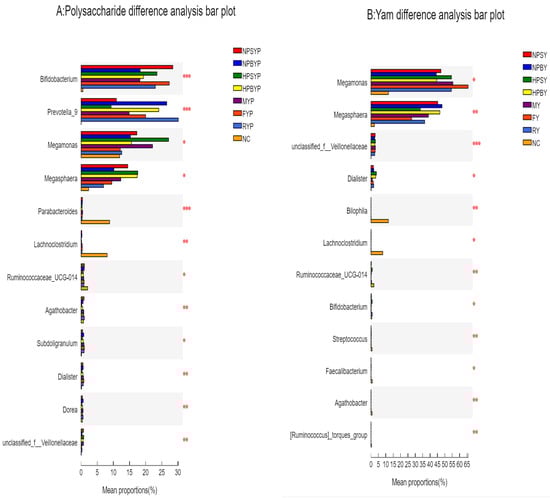 Bar chart of multi-species difference test. Note: A = Polysaccharide difference analysis bar plot, B = Yam difference analysis bar plot. The Y axis represents the species name at a taxonomic level, the X axis represents the average relative abundance in different groups of species, and the columns with different colors represent different groups. The rightmost side shows the p value, * 0.01 < p ≤ 0.05, ** 0.001 < p ≤ 0.01, *** p ≤ 0.001. NC = blank, NPSY = Normal-pressure steamed yam, NPBY = Normal-pressure boiled yam, HPSY = High-pressure steamed yam, HPBY = High-pressure boiled yam, MY = Microwaved yam, FY = Stir-fried yam. RY = Raw yam. NPSYP = Normal-pressure steamed yam polysaccharide, NPBYP = Normal-pressure boiled yam polysaccharide, HPSYP = High-pressure steamed yam polysaccharide, HPBYP = High-pressure boiled yam polysaccharide, MYP = Microwaved yam polysaccharide, FYP = Stir-fried yam polysaccharide, RYP = Raw yam polysaccharide.