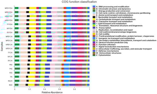 Histogram of COG function classification statistics. Note: 0 h fermentation broth, 24 h fermentation broth. NC = blank, NPSY = Normal-pressure steamed yam, NPBY = Normal-pressure boiled yam, HPSY = High-pressure steamed yam, HPBY = High-pressure boiled yam, MY = Microwaved yam, FY = Stir-fried yam. RY = Raw yam. NPSYP = Normal-pressure steamed yam polysaccharide, NPBYP = Normal-pressure boiled yam polysaccharide, HPSYP = High-pressure steamed yam polysaccharide, HPBYP = High-pressure boiled yam polysaccharide, MYP = Microwaved yam polysaccharide, FYP = Stir-fried yam polysaccharide RYP = Raw yam polysaccharide. PS: glucan standard (The molecular weight: 80 KD); P20: The molecular weight: 20 KD; P40: The molecular weight: 40 KD; P60: The molecular weight: 60 KD.
