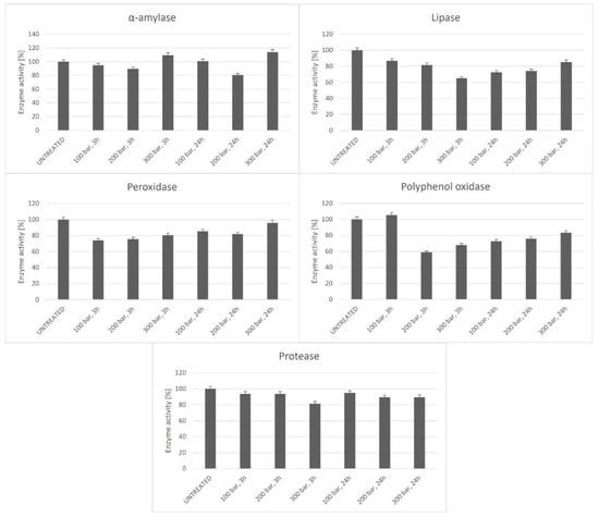 In this study, a green approach using scCO2 technology was used to process spelt flour. ScCO2 technology was checked for its great advantages for food processing; this involved its ability to preserve food quality due to the mild process conditions and, at the same time, to achieve a change in the activity of specific enzymes. The activities of α-amylase, lipase, peroxidase, polyphenol oxidase, and protease, which were detected in spelt flour before and after scCO2 treatment at different parameters, are presented in Figure 2. Data show that scCO2 affected the activity of individual enzymes, depending on the type of enzyme and process parameters. The most favorable parameters for α-amylase enzyme inactivation were 200 bar and 24 h, with 20% enzyme inactivation. The lipase and protease inactivation results showed that the highest level of inactivation was achieved at 300 bar and 3 h of exposure, as lipase activity achieved 65% under these conditions and protease achieved 81%. A minimum POD activity of 74% was observed at process exposure conditions of 100 bar and 3 h, whereas PPO activity was the lowest (59%) at 200 bar and 3 h. Oxidation of amino acids present in free and polypeptide chains is a primary mechanism of enzyme inactivation in scCO2, with additional occurrences of depolymerization of polypeptide chains and destruction of secondary structural elements of enzymes [].