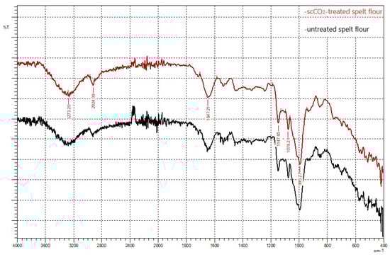 A FTIR spectrum of untreated and scCO2-treated spelt flour shows the contribution of different functional groups belonging to carbohydrates, lipids, proteins, and others, according to the main chemical composition of flour. FTIR analysis was performed for untreated and scCO2-treated spelt flour using an ATR accessory. Samples’ spectra were obtained over the range of 400 cm−1 and 4000 cm−1 with a spectral resolution of 0.5 cm−1. Figure 4 presents the FTIR analysis used for qualitative observation of changes in functional groups and further assessment of component modification. Figure 4 showed that there was no significant change in the FTIR pattern of untreated and scCO2-treated spelt flour, as the characteristic peaks occur at the same values in both spectra. The results demonstrated the band ~1078 cm−1 was related to the crystalline structure of starch, and the absorption band at ~995cm−1 in the starch region was linked to hydrated crystalline domains. A similar observation was reported previously by Zhou et al. in potato starch []. Moreover, FTIR patterns promptly indicated the presence of starch (1200–800 cm−1), lipids (2924, 2854, and 1740 cm−1), and proteins (1650–1500 cm−1) in both spelt flour samples, where minor differences, quantitative or structural, were difficult to detect [].
