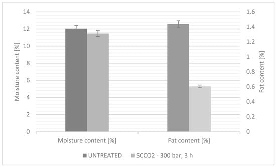 The moisture and fat content [%] comparison of untreated and scCO2-treated spelt flour.
