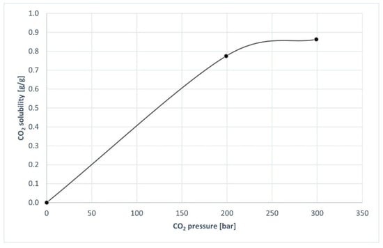 Equilibria solubility of CO2 was studied by the volumetric expansion of spelt flour saturated with CO2 on a magnetic suspension balance (MSB). The solubility of CO2 is the total amount of carbonate species that can be dissolved in the solution. Solubility of CO2 in spelt flour was measured by a gravimetric method involving magnetic suspension balance (MSB, RUBOTHERM, Bochum, Germany) at pressures ranging from 1 bar to 300 bar. The temperature of the cell was kept constant using a Lauda P5 thermostat. The software MessPro recorded the conditions (mass, temperature, pressure). The duration of the measurement at each pressure was approximately 120 min, as after this time, equilibrium was reached. To define the volume of the sample, a photo of the sample was taken with a digital camera and analyzed using ImageJ software [].