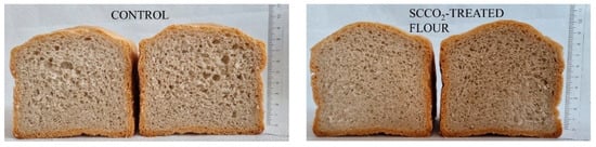 In many studies it was found out that enzymes application leads to the improved sensory quality of bread, which is the consequence of the improved flour quality. In addition, a dough that has more machine tolerance was created, and bread structure was enhanced []. The focus of this study was investigating the effects of change in enzyme activity in spelt flour by scCO2 treatment on flour properties and the quality of baked bread. Figure 7 shows the difference in the final product—bread with untreated and scCO2-treated spelt flour. It can be seen that bread made from scCO2-treated spelt flour was higher and, consequently, had a higher specific surface volume, which indicated that scCO2 has a positive effect on exposed spelt flour, where inactivation of certain enzymes and hyperactivation of α-amylase enzyme gave bread with better characteristics compared to control bread, where untreated spelt flour was used. Additionally, our findings from the determination of the activity of individual enzymes are consistent with the final product, as the presence of the enzyme α-amylase had a positive effect on the rising process, whereby it improved the internal texture of bread and increased the volume of bread. The average height of bread calculated using the ImageJ program for bread baked from untreated (control) spelt flour in three different samples was 10.2 ± 0.25 cm, while the average height of bread beaked from scCO2-treated spelt flour in three different samples was 10.4 ± 0.17 cm. In accordance with these measurements, measurements of the specific surface volume of the bread were also carried out, and it was found that the bread from untreated spelt flour has a specific surface volume 2.74 ± 0.1 cm3/g, which is slightly lower than bread baked from scCO2-treated spelt flour with specific volume 2.81 ± 0.08 cm3/g.
