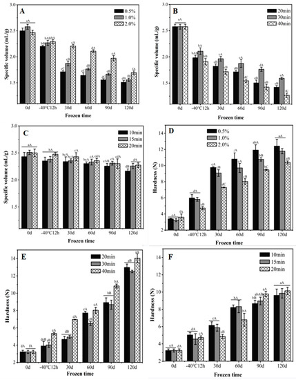 Effects of frozen storage on the specific volume and hardness of steamed buns made from unfermented frozen dough with yeast additions of 0.5%, 1.0% and 2.0% (A,D); pre-fermented frozen dough with the pre-fermented time of 20, 30 and 40 min (B,E); the par-steamed frozen dough with the pre-steamed time of 10, 15 and 20 min (C,F). Data with different lowercase and uppercase letters indicate the significant differences among the frozen dough with different storage time and different processing variables, respectively (p < 0.05).
