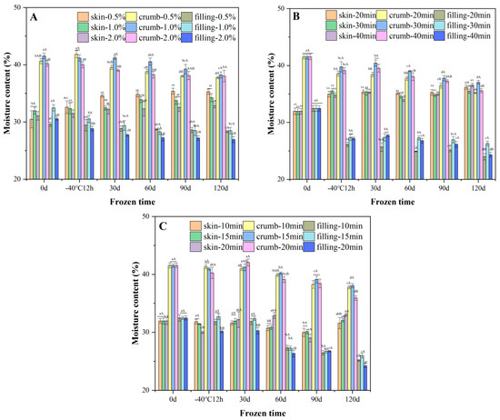 Effects of frozen storage on the moisture content distribution of steamed buns made from unfermented (A), pre-fermented (B) and par-steamed (C) dough. Data with different lowercase and uppercase letters indicate the significant differences among the frozen doughs with different storage times and different processing variables, respectively (p < 0.05).