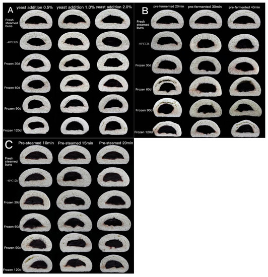 The cross section image of steamed buns made from un-fermented (A), pre-fermented (B) and par-steamed (C) frozen dough.