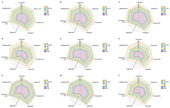 The sensory properties indexes including color, tissue, texture, taste, odor, chewiness and stickiness were used to characterize the changes of sensory attributes of steamed buns with different processes during frozen storage (Figure 4). With the increased frozen storage time, the closed area on the radar map significantly decreased, indicating that the sensory quality of frozen dough buns with different processes decreased by varying degrees. The sensory scores of chewiness and the tissue morphology of unfermented frozen dough were significantly lowered during frozen storage (Figure 4A–C), indicating that the buns made from unfermented frozen dough were less chewable, and the skin appeared to be wrinkled or collapsed [29]. Frozen dough with 2.0% yeast possessed the largest enclosed area and thus the highest sensory quality. When frozen stored for 120 d, the 30 min pre-fermented frozen dough buns possessed a higher sensory score than the 20 and 40 min pre-fermented frozen dough buns (Figure 4D–F). Compared with the par-steamed frozen dough buns with a pre-steamed time of 20 min (Figure 4G–I), the dough pre-steamed for 10 and 15 min had a higher sensory quality during frozen storage. The amount of flavor compounds formed in steamed buns could be affected by yeast amount and activity, steaming time as well as the temperature. From the sensory quality of steamed buns, it could be concluded that the optimum processes for each frozen dough was the un-fermented frozen dough with 2% yeast, dough pre-fermented for 30 min and dough pre-steamed for 15 min, which possessed a higher sensory quality.
