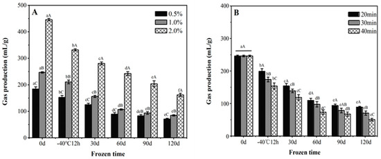 The effect of frozen storage on the gas production capacity of unfermented (A) and pre-fermented (B) frozen dough. Data with different lowercase and uppercase letters indicate the significant differences among the frozen doughs with different storage times and different processing variables, respectively (p < 0.05).