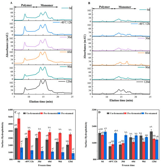 Representative SE-HPLC profile of unfermented (A) and par-steamed frozen dough buns(B), and the variation of surface hydrophobicity of gluten proteins in doughs (C) and steamed buns (D) during frozen storage. Data with different lowercase and uppercase letters indicate the significant differences among the frozen doughs with different storage times and different processing techniques, respectively (p < 0.05).