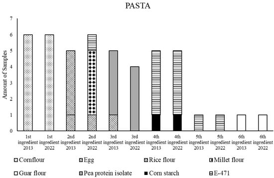 Compared to the 2013 data, the pasta group stands out from the rest. Energy (−1.1%), protein (−7.2%), simple carbohydrates (−7.5%), saturated lipids (−44.1%), dietary fiber (−23.5%), and salt (−81.6%) contents decreased significantly (Table 1). In order to explain the nutritional variations observed in the pasta group over time, ingredients used to make all the GFPs classified as pasta (n = 6) were analyzed in both years, 2013 and 2022. Concretely, the foods’ ingredient information and order on their labels were taken into account. It is important to highlight that ingredients are listed in order of weight, beginning with the ingredient that weighs the most and ending with the ingredient that weighs the least.