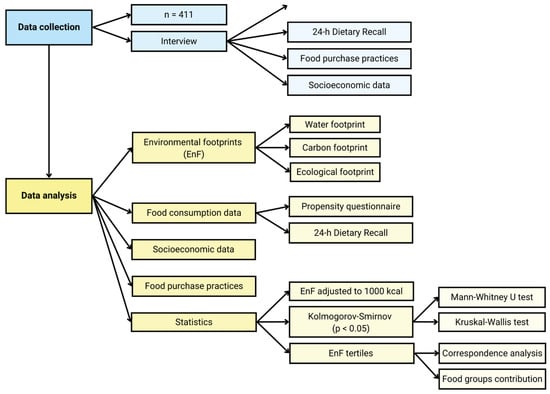 | Socioeconomic characteristics influence the dietary environmental footprints of adults and elderly people living in Natal, RN, Brazil. | Dietary environmental footprints (CF estimated in gCO2/person/day/1000 kcal, WF estimated in L/person/day/1000 kcal, EF estimated in m2/person/day/1000 kcal) and their relationship with socioeconomic variables (sex, age, ethnicity, schooling, and monthly per capita family income). | [3,14,18,19,25,28,37,38] |